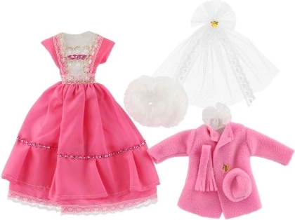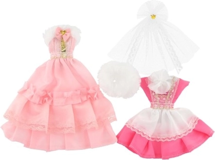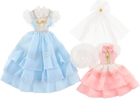 Twee verschillende sets jurken, elk met eigen details, die elke pop een uitzonderlijke uitstraling geven.