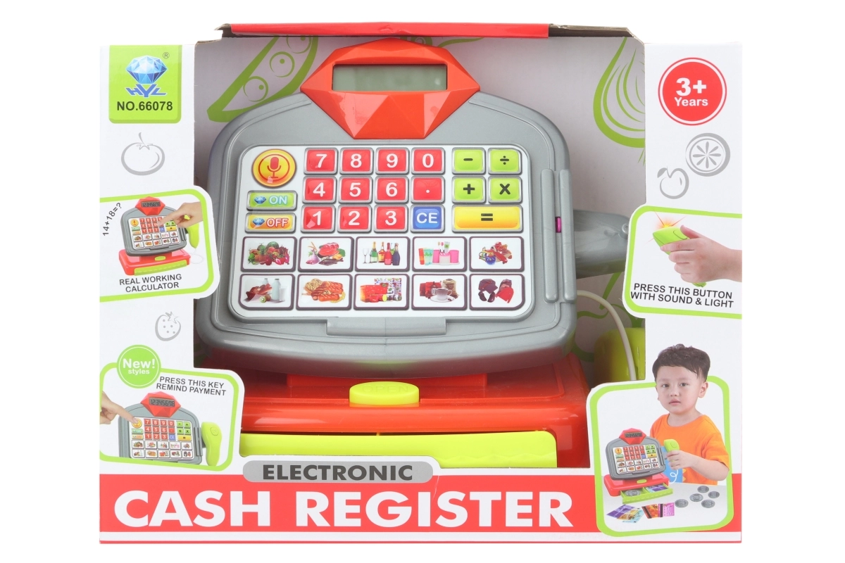 Plastic elektronische kassa op batterijen. De kassa heeft een uitschuiflade voor geld, een kaartlezer en een barcodescanner. De kassa maakt geluiden, licht op en kan rekenen. Inclusief speelgeld. Werkt op 3 AA-batterijen (niet inbegrepen). Afmetingen kassa ca. 17,5 x 19 x 12,5 cm. Afmetingen verpakking ca. 27 x 21,5 x 14 cm. Leeftijd 3+
