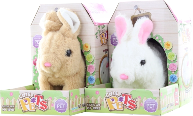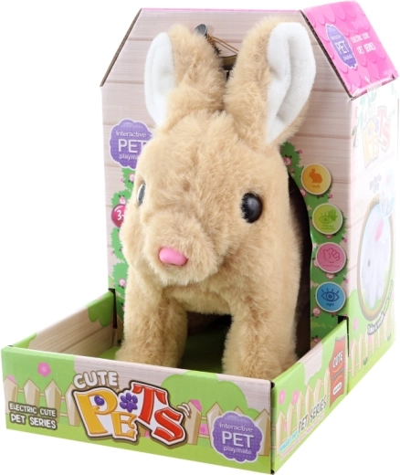 Pluchen konijn op batterijen. Het konijn springt, maakt geluiden en kwispelt met zijn staart. Werkt op 2 AA-batterijen (niet inbegrepen). Afmetingen van het konijn ca. 15 x 19 x 7,5 cm. Afmetingen van de verpakking ca. 13 x 19 x 18 cm (de verpakking dient ook als huisje). Leeftijd 3+