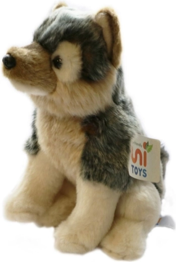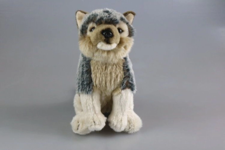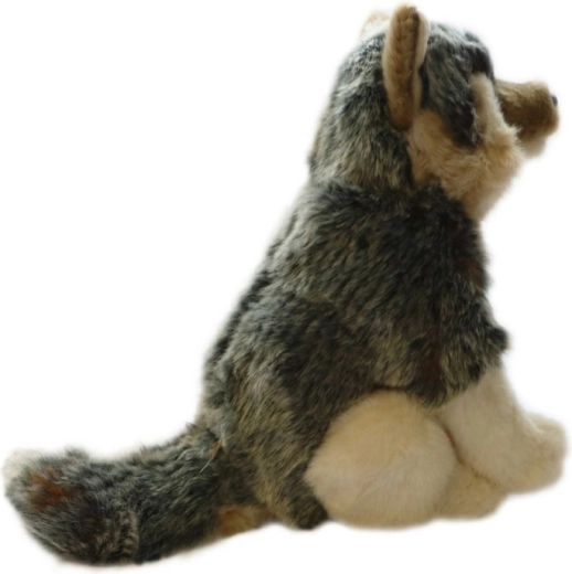Pluchen zittende wolf met een afmeting van ca. 20 x 24 x 11 cm (zonder staart). Staartlengte ca. 9 cm. Leeftijd 0+