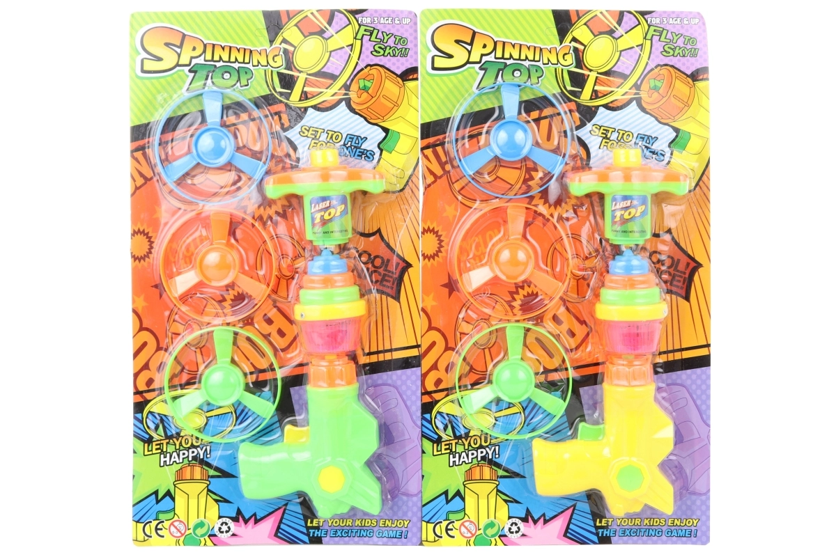 Leuk batterij-aangedreven kinderspeelgoedpistool met propellers zorgt voor uren actie en plezier. In de verpakking vind je het pistool, 3 vliegende propellers en een gekleurde tol. Eenvoudige bediening, AG13-batterijen inbegrepen en veilig speelplezier voor kinderen vanaf 3 jaar.