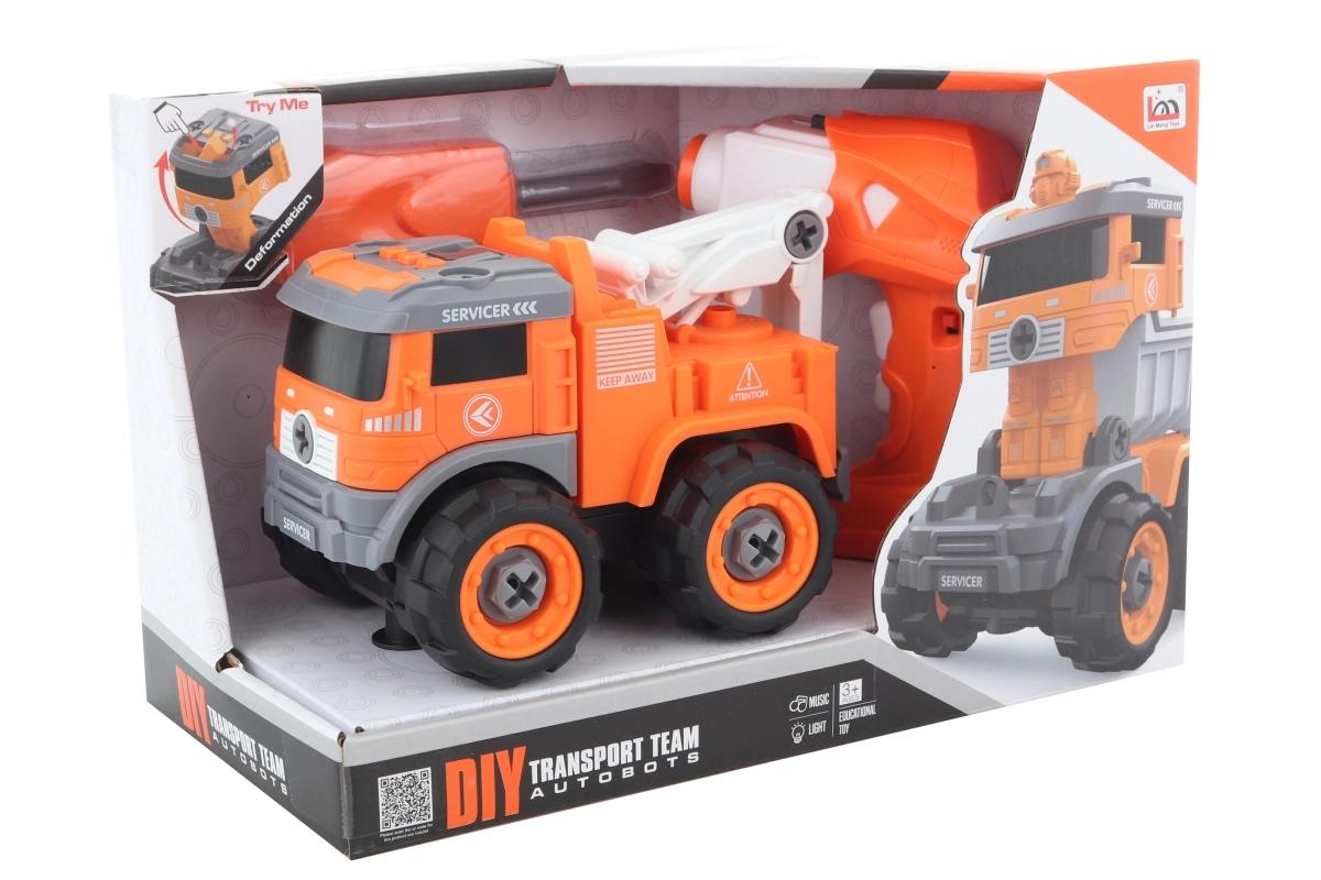 Deze interactieve schroefbare sleepwagen is een geweldige keuze voor kleine doe-het-zelvers. Kinderen schroeven de auto zelf in elkaar met de schroevendraaier of de boormachine, waarvan de motor kan worden uitgenomen en in de auto geplaatst. Daarna kunnen ze de rit vooruit en achteruit besturen met de afstandsbediening. De auto is ook eenvoudig te transformeren tot een robot, wat de speelduur verlengt en de fantasie prikkelt.