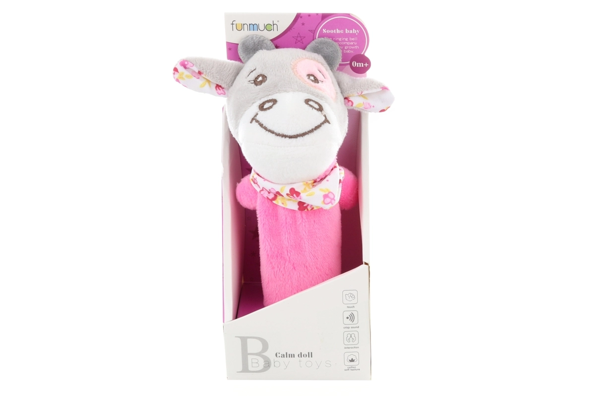 Deze piepende rammelaar in de vorm van een roze koe voelt zijdezacht aan en is ontworpen voor de allerkleinsten. Bij indrukken geeft hij een zacht piepgeluid dat de aandacht trekt en de gehoorontwikkeling ondersteunt. Dankzij het compacte formaat ligt hij goed in de hand en is hij ideaal voor het trainen van de fijne motoriek en de grijpreflex.