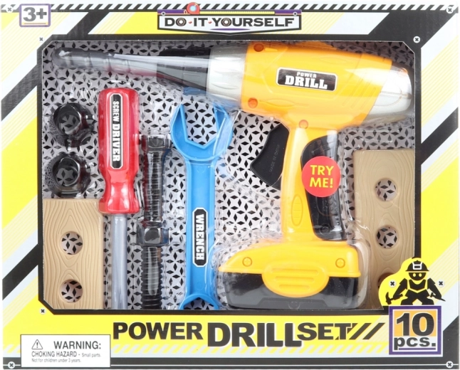 Leuke en veilige kinder-gereedschapsset met een realistische boormachine zonder batterijen, die bij het indrukken draait en zoemt. Inclusief schroevendraaier, steeksleutel, houten latjes en schroeven voor creatief monteren. Ideaal voor kinderen vanaf 3 jaar.