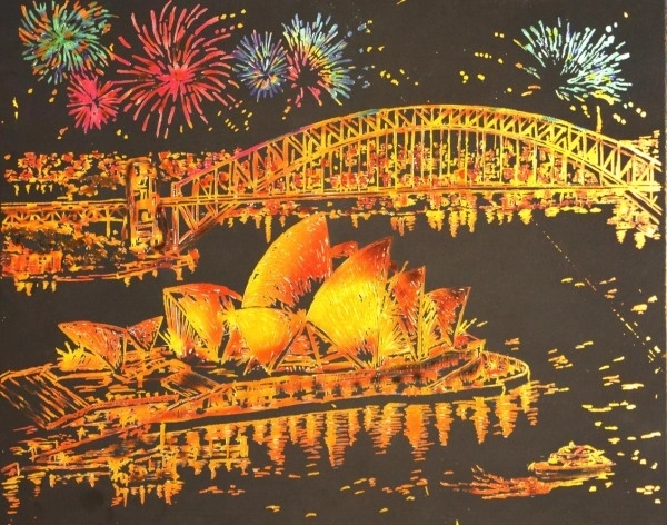 Ontdek de magie van de krastechniek: onder de zwarte laag schuilt een gouden ondergrond die van elke vrijgekraste streek een contrasterend, elegant effect maakt. Het motief van het iconische Sydney Opera House in nachtelijke uitvoering zal zowel beginners als gevorderden bekoren en het eindresultaat wordt een originele decoratie.