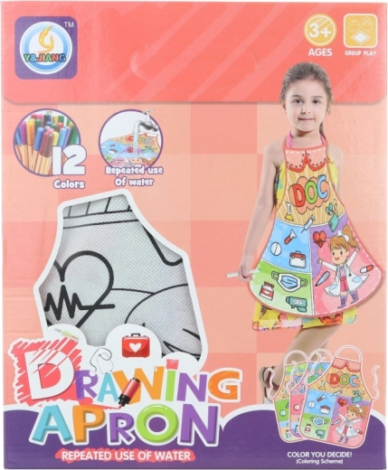 Ontdek knutselen zonder rommel – het kleur-schort voor kinderen van ca. 36 × 46 cm heeft een afwasbaar oppervlak, dus even onder de kraan en je kunt opnieuw en opnieuw kleuren. In de verpakking zitten 12 gekleurde stiften, ideaal voor kinderen vanaf 3 jaar.