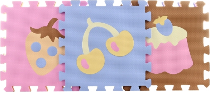 Een schattige foam speelmat met motief van lekkernijen, fruit en desserts creëert een veilige en zachte speelruimte. Dempt geluid, isoleert tegen kou, is afwasbaar en dankzij het geribbelde oppervlak antislip. De set bevat 9 vierkante delen van 28 × 28 cm en een dikte van 0,7 cm.
