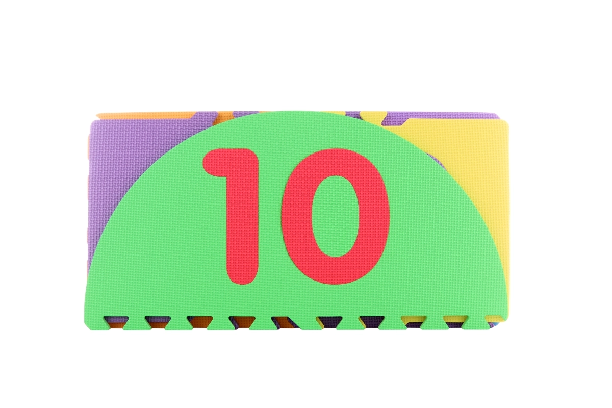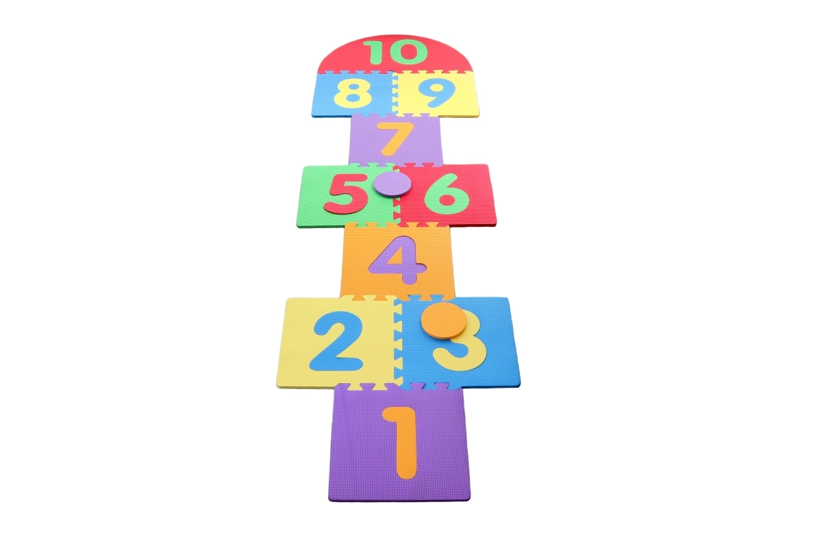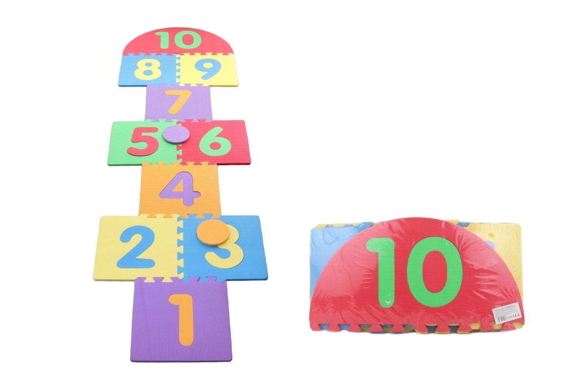 Schuimpuzzel in de vorm van een hinkelbaan. Bevat 10 stukjes. Afmetingen van de verpakking ca. 56 x 30 x 6,5 cm. Leeftijd 3+