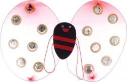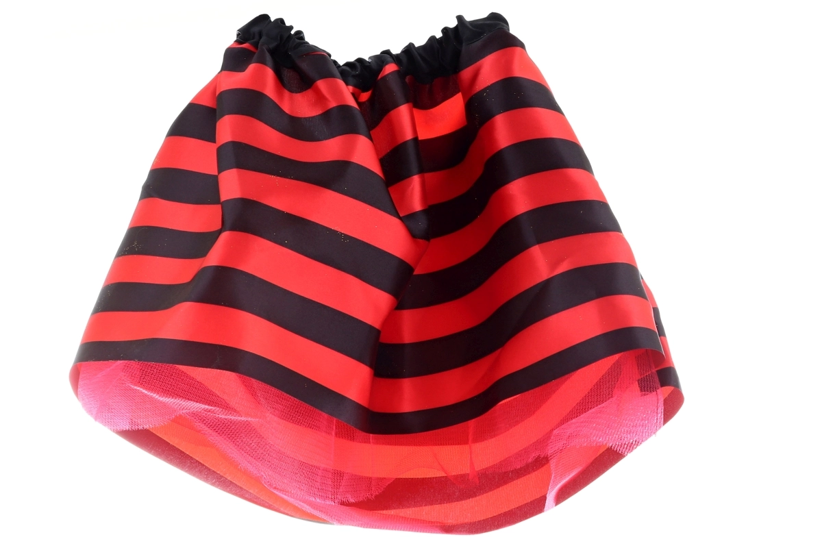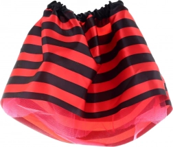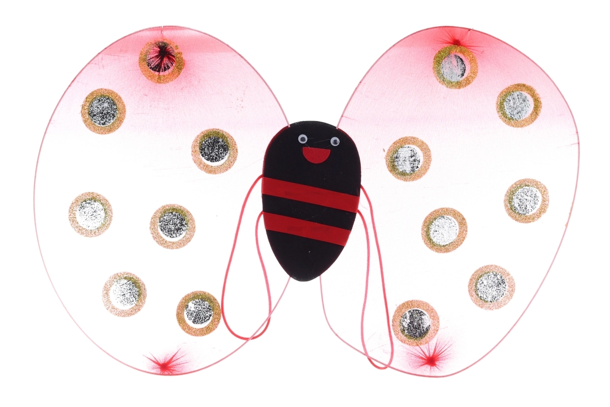 De set bestaat uit transparante roze-rode vleugels met glinsterende stipjes, een elastische rok in rood-zwarte strepen, een haarband met flexibele voelsprieten en een bijpassende staf met linten. De maat is ontworpen voor kinderen vanaf 3 jaar; afmeting van de verpakking ca. 49 × 57 cm.