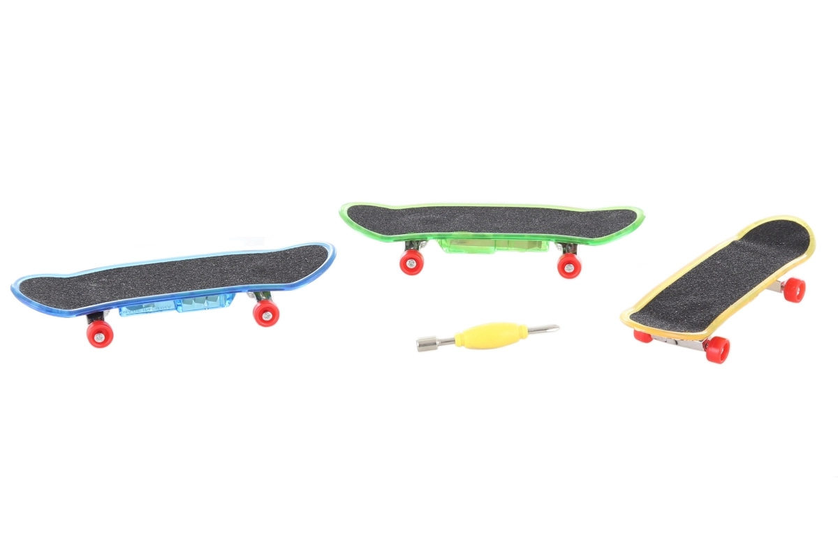 In de verpakking vind je 3 mini-skateboards en een schroefgereedschap. AG13-batterijen zijn inbegrepen, dus je kunt meteen beginnen.