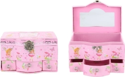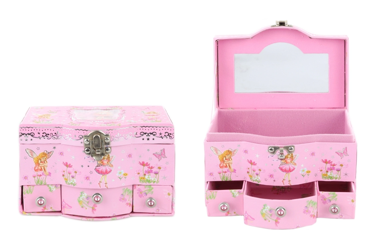 Sieradendoosje met laden. Aan de binnenkant van het deksel zit een spiegeltje en in het onderste deel van het doosje bevinden zich 3 praktische laatjes. Afmetingen van het sieradendoosje ca. 17 × 11,5 × 10 cm. Verpakt in een zakje. Leeftijd 3+