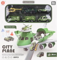 Vliegtuig met uitklapbare garage en militaire autootjes