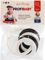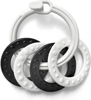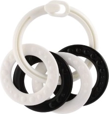 Deze set ringen in zwart-wit is ontworpen voor de allerkleinsten. Contrasterende kleuren trekken de aandacht, helpen de concentratie te trainen en ondersteunen de gezonde ontwikkeling van het gezichtsvermogen. Dankzij de verschillende vormen en texturen oefent je kind de fijne motoriek en oog-handcoördinatie.