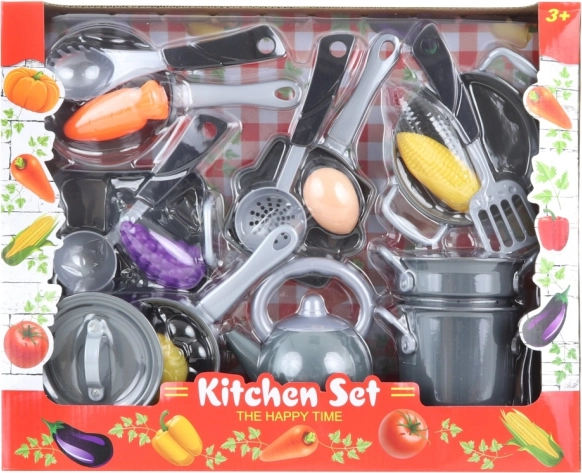 Complete kinderkeukenset voor kleine chefs met alles wat nodig is voor creatief spel. Bevat een steelpan met deksel, pan met vergiet, waterketel, braadslede, koekenpannen, wok en andere accessoires en etenswaren. Ideaal voor kinderen vanaf 3 jaar. Stimuleert fantasie, rollenspel en fijne motoriek.