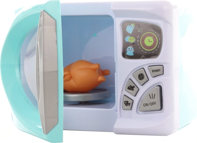 Deze kindermagnetron in turquoise met wit is de ideale aanvulling op elke speelkeuken. Na het inschakelen draait het plateau en het spel wordt begeleid door lichteffecten die een echt apparaat natuurgetrouw nabootsen.