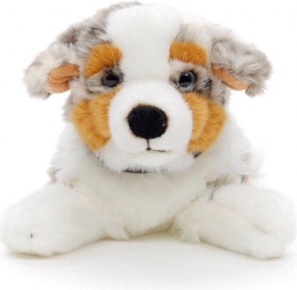 Een schattige pluchen hond van het ras Australische herder in liggende houding die zowel kinderen als dierenliefhebbers zal bekoren. Hij is zacht, fluweelachtig en dankzij het eco‑friendly ontwerp vriendelijk voor de natuur. Ideaal om mee te knuffelen, om mee te spelen of als decoratie in de kinderkamer.