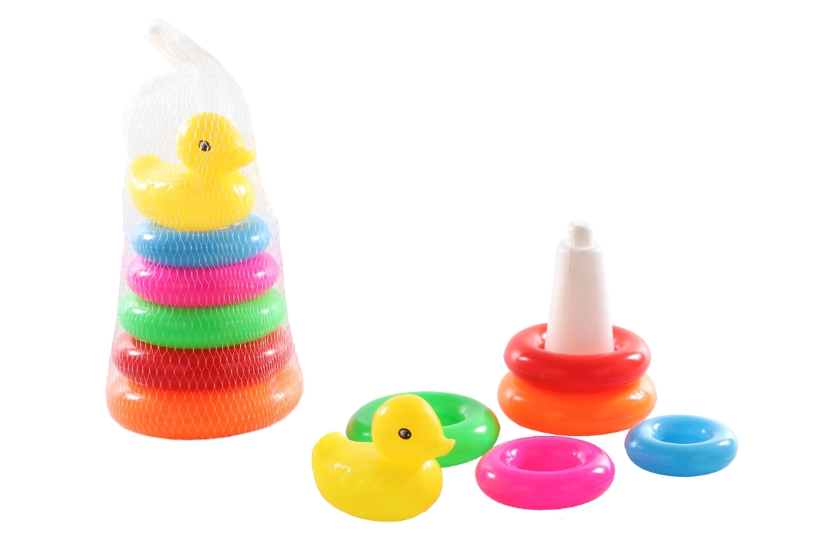 Een schattige plastic stapeltoren in kegelvorm met een eendje maakt kinderen vanaf 12 maanden blij. Stimuleert de fijne motoriek, coördinatievaardigheden en herkenning van vormen en maten tijdens veilig spelen.