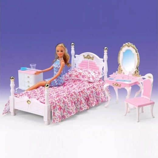 De Glorie Slaapkamer bevat een plastic bed van ca. 16 cm x 34 cm x 18 cm met een sprei over het bed en een kussentje, een kaptafel van ca. 13 cm x 8 cm x 22 cm met accessoires voor poppen – kam, armband, borstel en flesjes, een stoel van ca. 7 cm x 7 cm x 13 cm, en een nachtkastje van ca. 8,5 cm x 6 cm x 8 cm. Pop niet inbegrepen. Leeftijd 3+