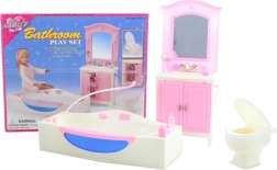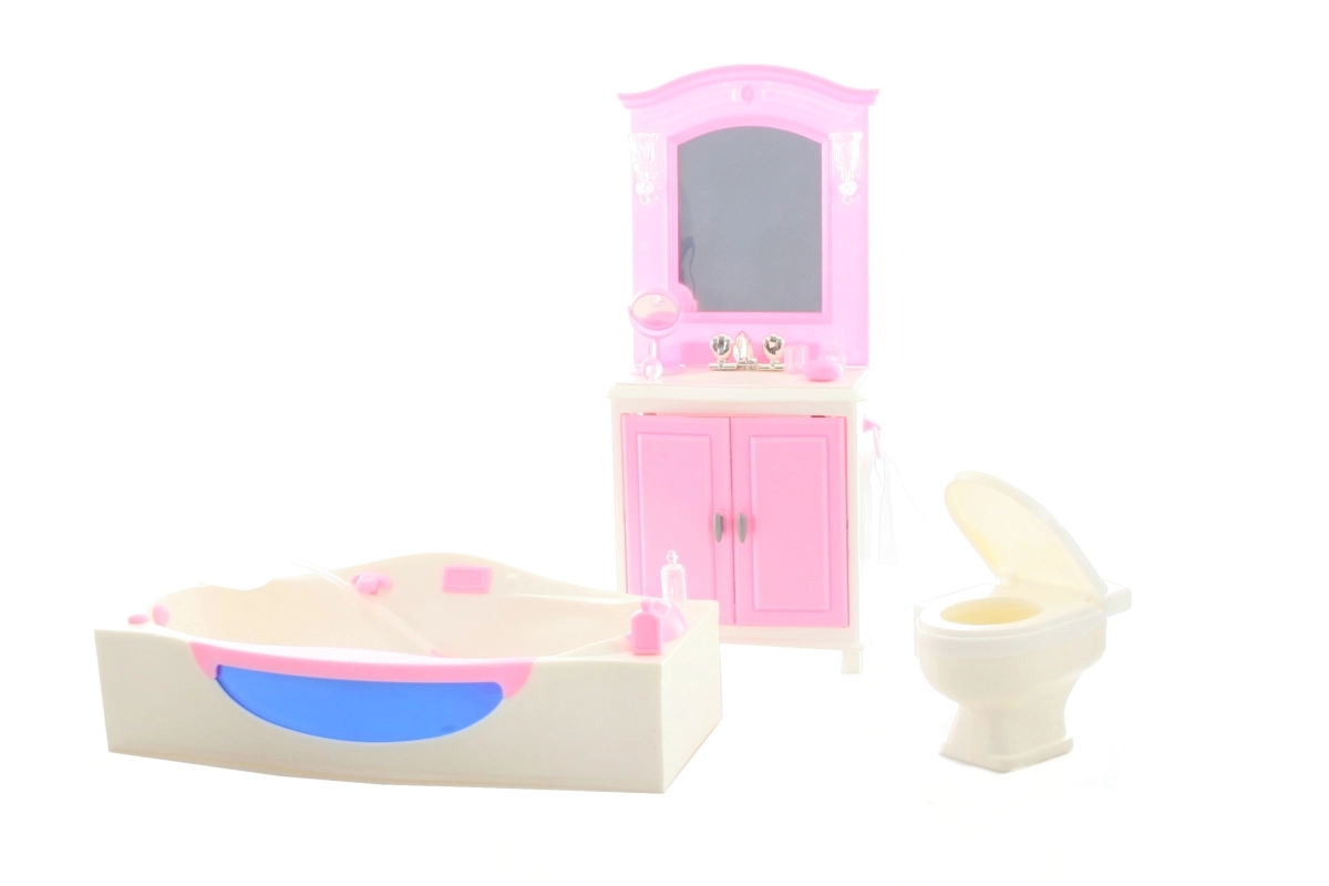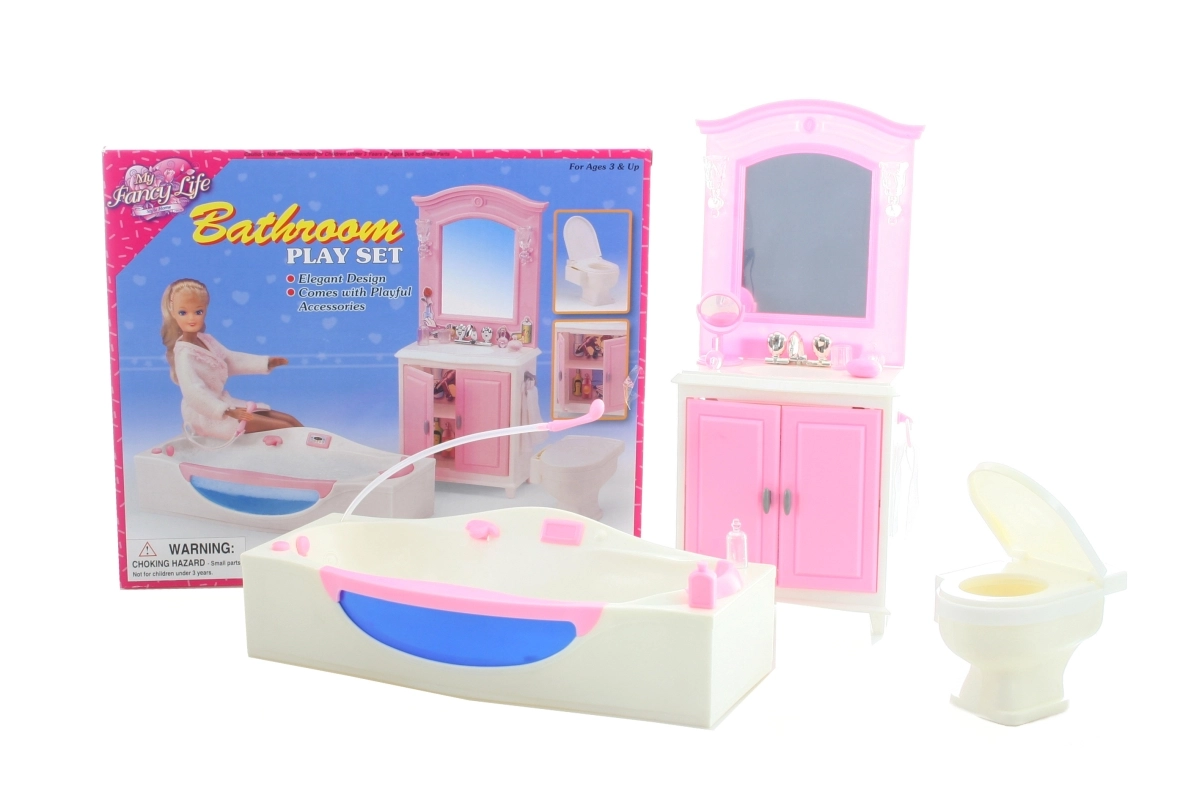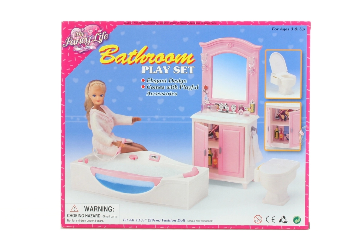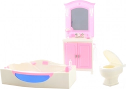 De inhoud van de verpakking omvat een kaptafel met wastafel, een bad en een toilet, evenals kleine accessoires die de sfeer van een echte badkamer compleet maken. De kunststof uitvoering zorgt voor eenvoudig onderhoud en een lange levensduur bij dagelijks spelen.