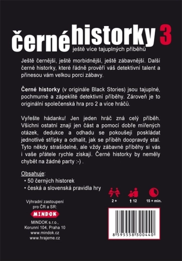 Zwarte Verhalen 3 biedt nog duisterdere, morbide en vermakelijke verhalen die je zowel zullen amuseren als je hersenen laten kraken. Eén speler kent de volledige zaak, de anderen proberen met vragen, deductie en logica de puzzelstukjes te verzamelen en het mysterie te ontrafelen. Ideaal voor avonden met vrienden, familiegelegenheden of als ijsbreker op een feestje.