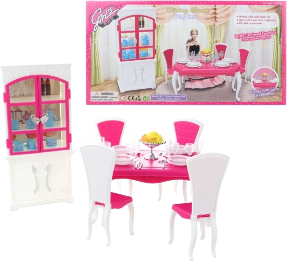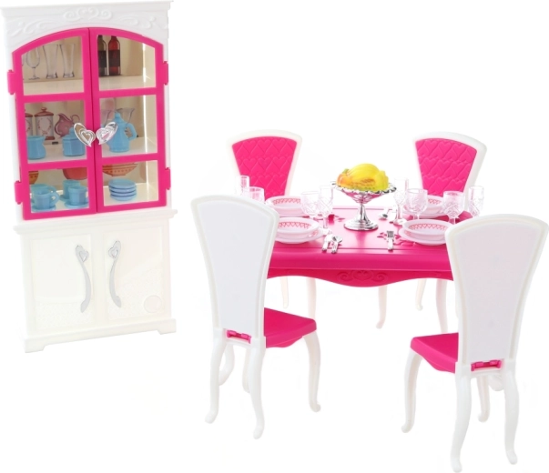 De Glorie eetset voor poppen biedt een complete eetervaring met een elegante plastic tafel, vier stoelen en een kastje, aangevuld met borden, glaasjes, bestek en decoratieve accessoires.