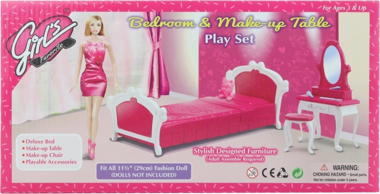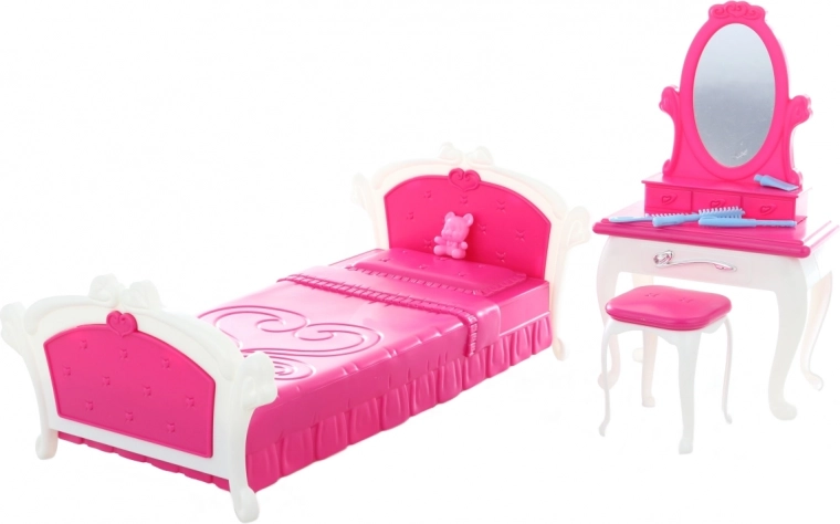 Stijlvolle set voor de kinderkamer van poppen met een kunststof bed en een kaptafel met accessoires. Ideaal voor creatief spel vanaf 3 jaar. Inbegrepen zijn een kam, crème, borstel en krukje. Pop niet inbegrepen.