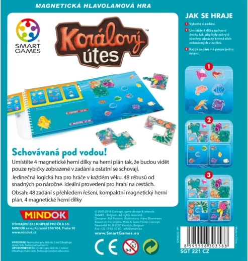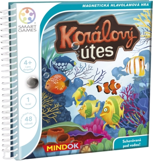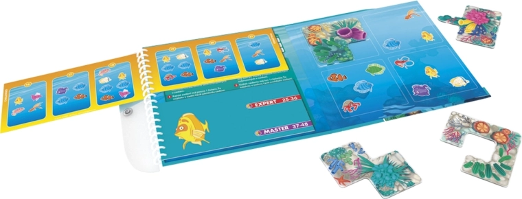 Het spel Koraalrif biedt leuke en slimme breinbrekers voor zowel kinderen als volwassenen. Jouw taak is om vier magnetische stukken op het speelbord te plaatsen zodat alleen de in de opdracht genoemde visjes zichtbaar blijven – de rest moet verborgen worden. Dankzij de magneten is het spel stabiel en perfect geschikt voor auto, trein en vliegtuig.