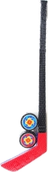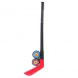 Twee plastic hockeysticks in een net, lengte ca. 57 cm, elk in een andere kleur, en 2 pucks. Leeftijd 3+
