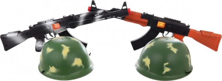 Een leuke kinderset voor kleine soldaten met een ratelend plastic machinegeweer van circa 53 cm en een militaire helm met een binnendiameter van circa 18,5 cm. Een geweldige keuze voor soldaatje spelen, het stimuleren van de fantasie en actieve avonturen. Geschikt voor kinderen vanaf 3 jaar.