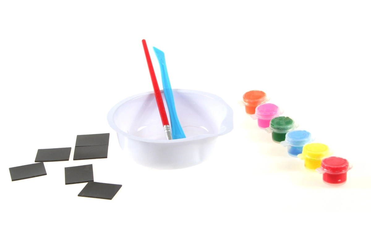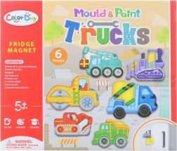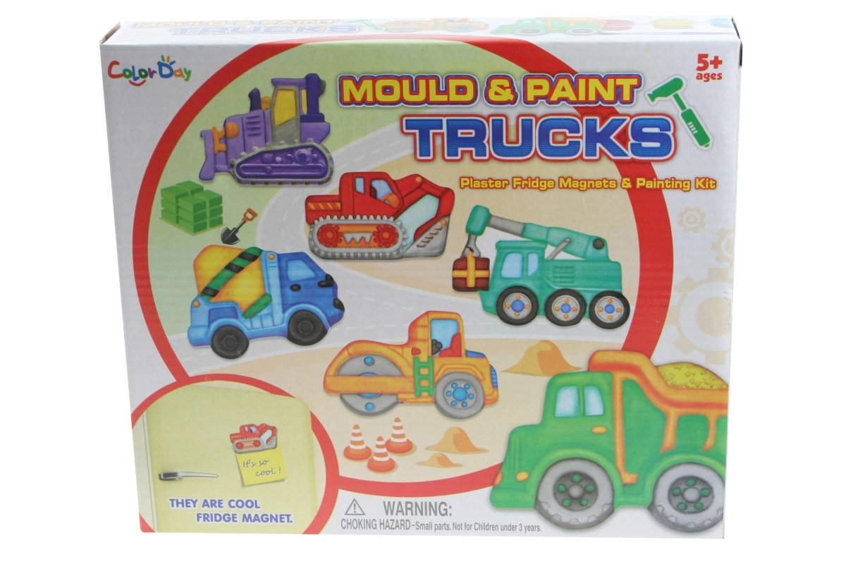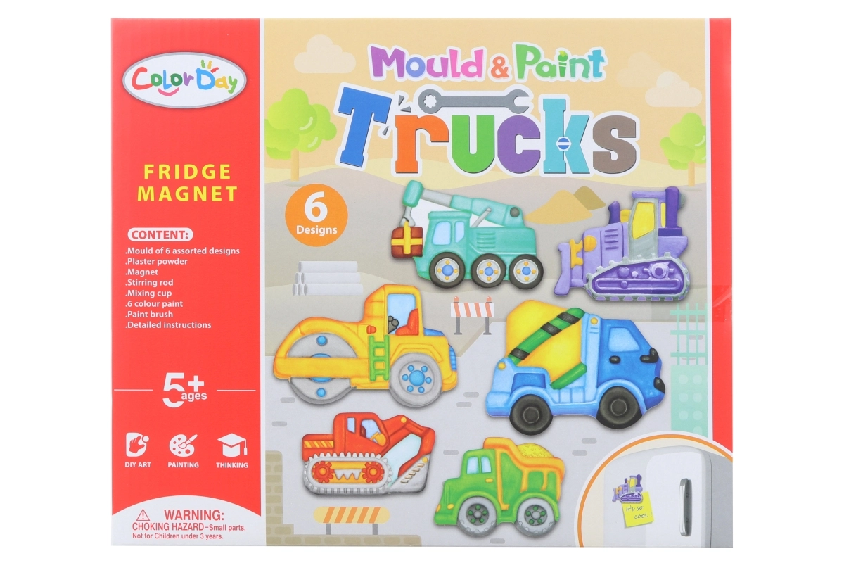 Verander knutselen in een bouwavontuur. Met deze set gieten kinderen magneten van gips in een mal met 6 bouwvoertuigmotieven, schilderen ze met de meegeleverde verf en maken er met de magneten vrolijke decoraties voor de koelkast of magneetbord van.