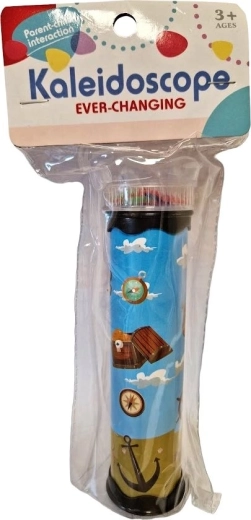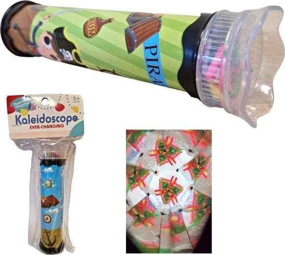 Kinderkleurige caleidoscoop met een afbeelding van een piraat. Afmeting caleidoscoop ca. 17 x 5 cm. Afmetingen verpakking ca. 10,5 x 24 x 5 cm. Leeftijd 3+