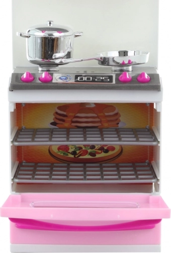 Dit keukenblok verrast met lichteffecten op de kookplaten en in de oven, die het spel een realistisch karakter geven. De ovendeur kan gemakkelijk worden geopend voor toegang tot denkbeeldige lekkernijen.