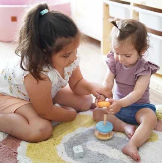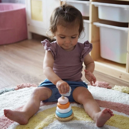 Het plaatsen van de ringen op het platform brengt niet alleen plezier voor kinderen, maar ontwikkelt ook hun coördinerende vaardigheden en logisch denken. Kinderen leren ook kleuren herkennen en werken met verschillende vormen.