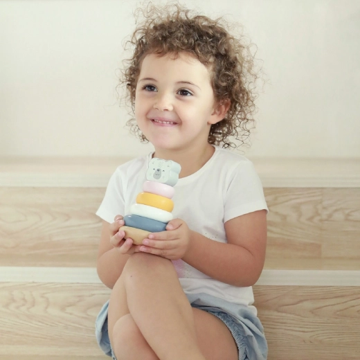 De set bevat zes pastelkleurige ringen, inclusief de hoofd ring met berenhoofd, die visuele en motorische vaardigheden ontwikkelen.