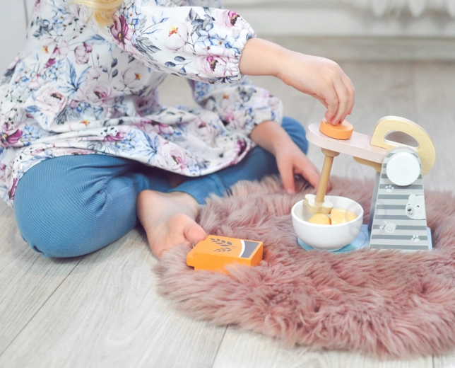 Deze roze-grijze mixer met opklapbare arm en stijlvolle designelementen stelt kinderen in staat kookvaardigheden te simuleren in rollenspellen. De mixer heeft een praktische handgreep, zodat kinderen de kom gemakkelijk kunnen plaatsen of verwijderen, wat hun motorische vaardigheden stimuleert.