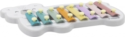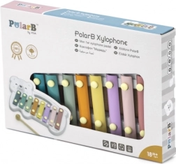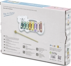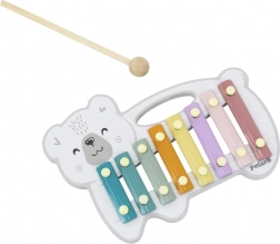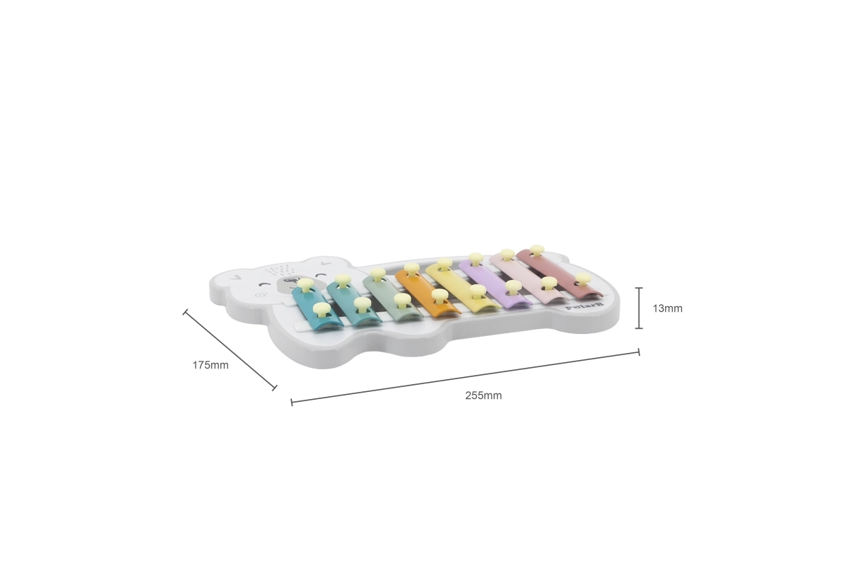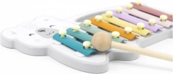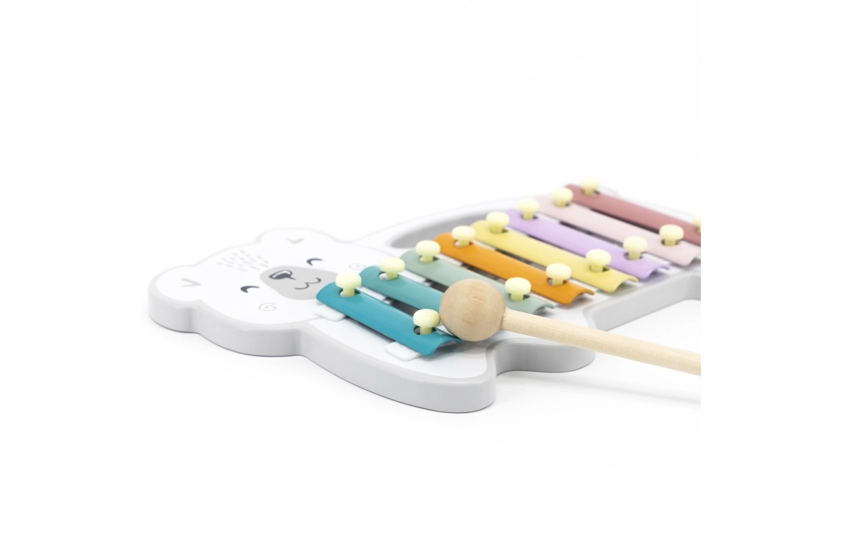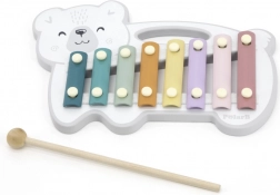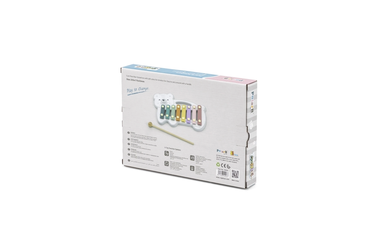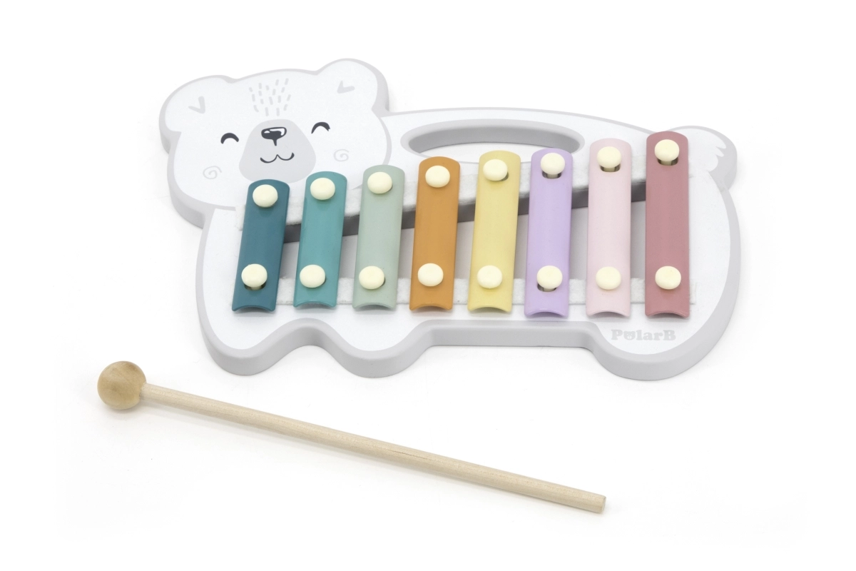 De houten xylofoon in de vorm van een ijsbeer combineert een speelse uitstraling met een functioneel muziekinstrument. Pastelkleurige metalen lamellen produceren een aangename klank bij aanslag met de houten slagstok, waardoor kinderen van nature worden gemotiveerd om te experimenteren met geluiden en ritme.