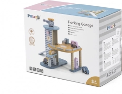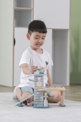 De houten garage biedt volop mogelijkheden voor interactief spel dankzij geïntegreerde functies zoals een wasstraat, een tankstation en een lift.