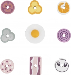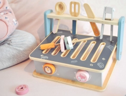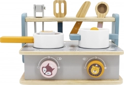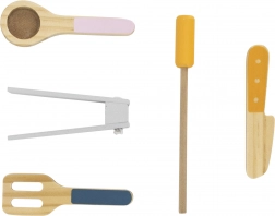Twee pannen, een mes, lepel, spatel, tang, spiesen voor spiesjes en houten etenswaren (vlees, eieren, groenten) stimuleren fantasierijk rollenspel zonder extra aankopen.
