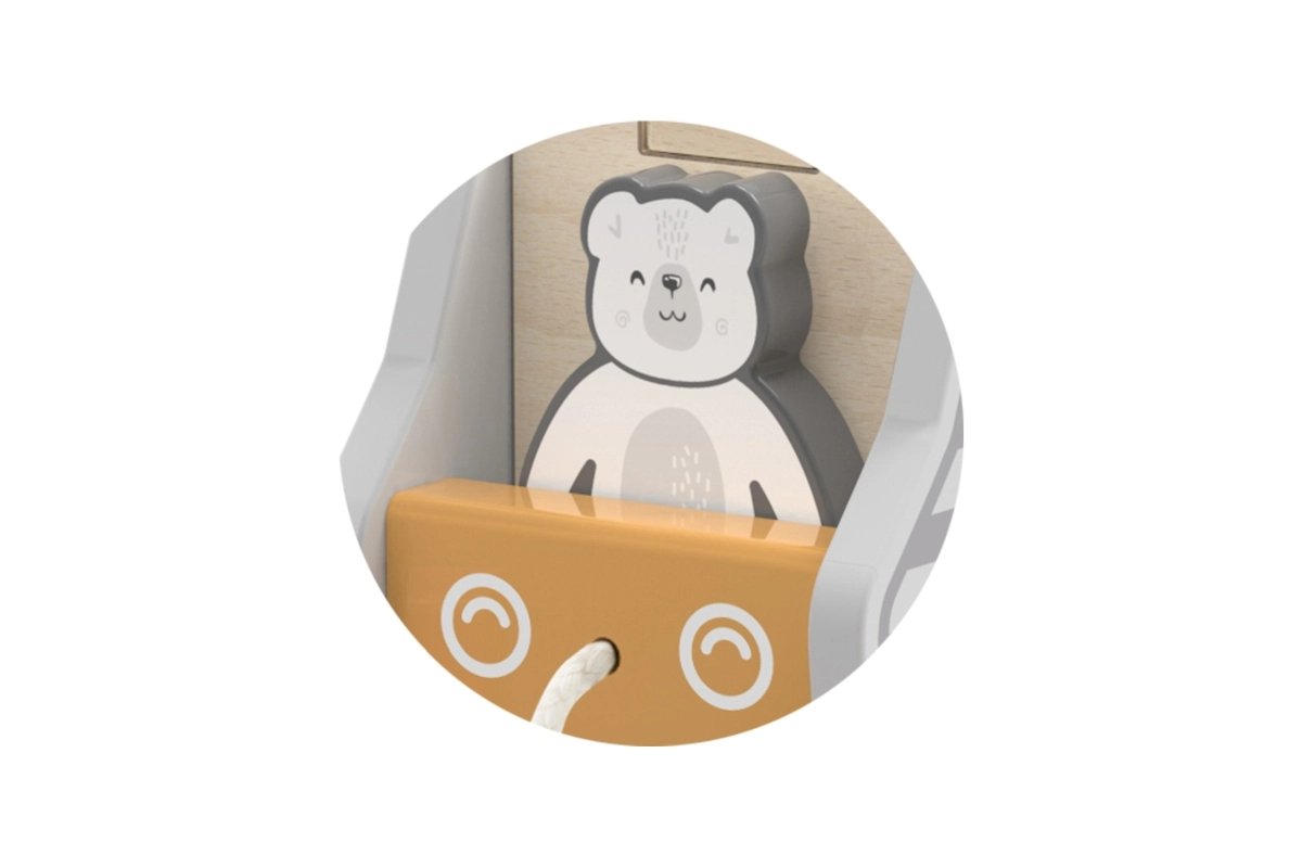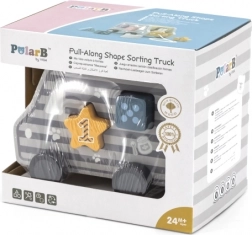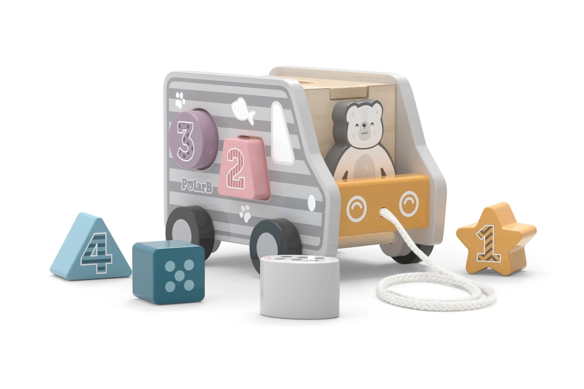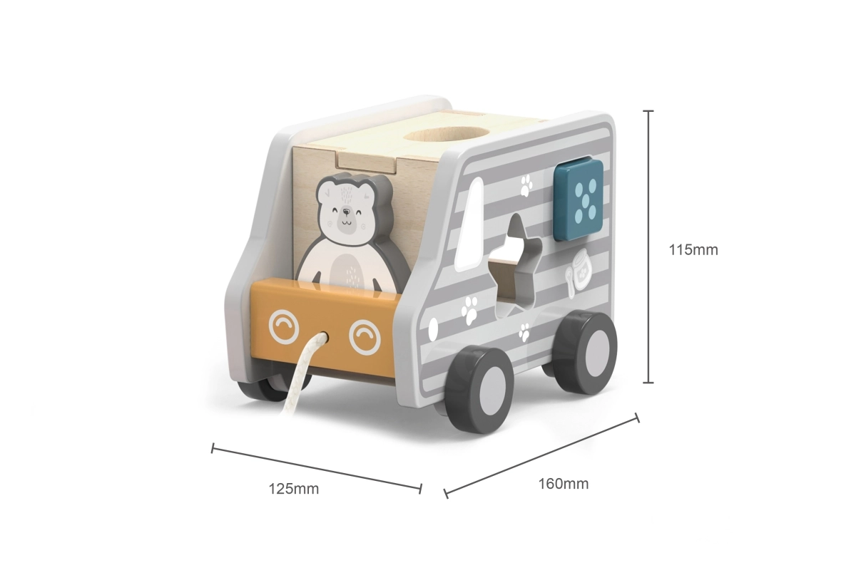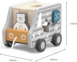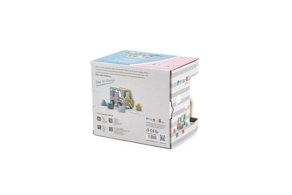 Houten trek- en inbouwspeelgoed in de vorm van een vrachtwagen. Afmetingen ca. 18 x 12 x 6,5 cm. Afmetingen verpakking ca. 19 x 16,5 x 13,5 cm. Leeftijd 18m+