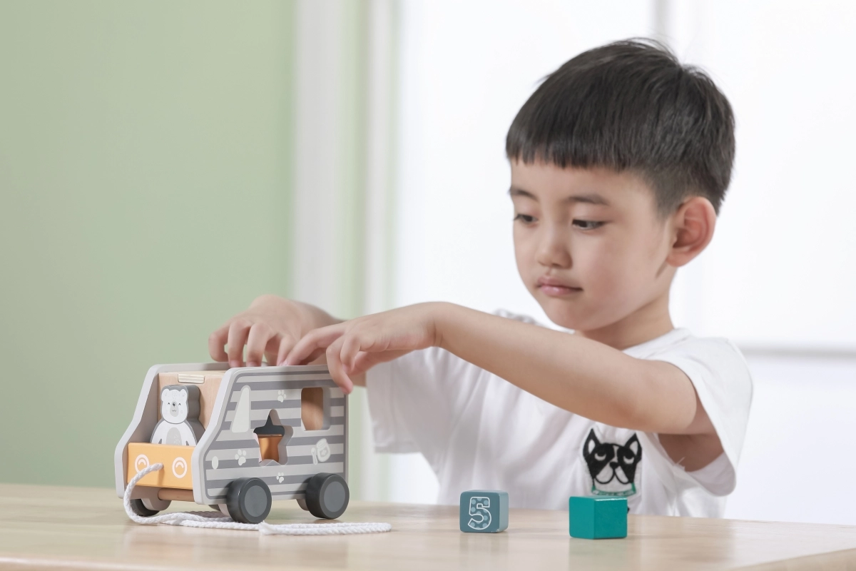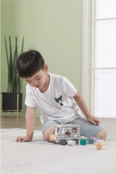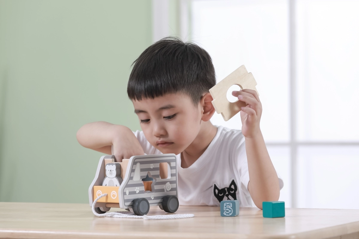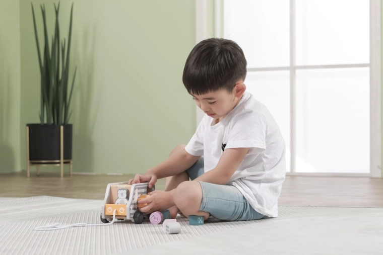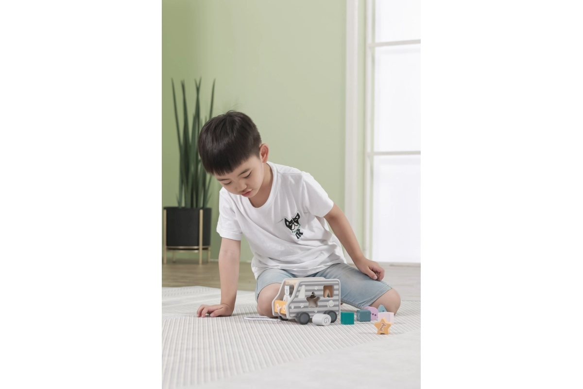 Houten trek- en inbouwspeelgoed in de vorm van een vrachtwagen. Afmetingen ca. 18 x 12 x 6,5 cm. Afmetingen verpakking ca. 19 x 16,5 x 13,5 cm. Leeftijd 18m+