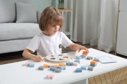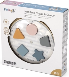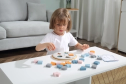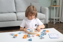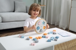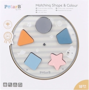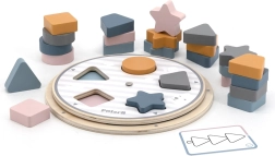 Kinderen plaatsen de houten stukken in de uitsparingen op het bord en maken zo op natuurlijke wijze kennis met kleuren en basale vormen – cirkel, vierkant, driehoek en ster.