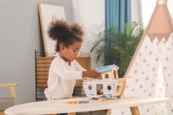 Hoogwaardig hout, afgeronde randen en aangename kleuren zorgen voor veilig spel, ook voor de allerkleinsten. Ideaal voor de kinderkamer en voor op reis.