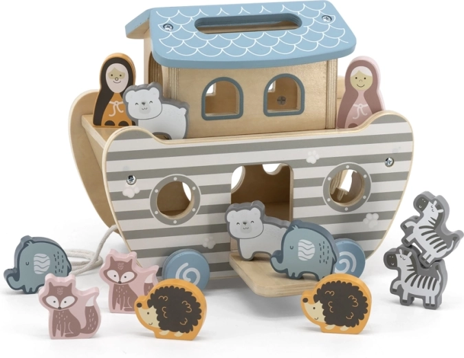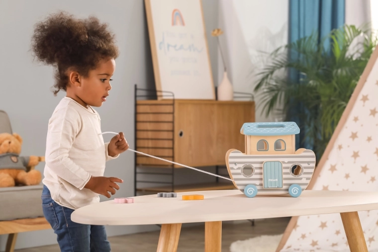 Dankzij het koord kan de ark eenvoudig door de kamer worden getrokken. Kinderen ontwikkelen balans, lopen en bewegingsritme tijdens het speelse rijden.
