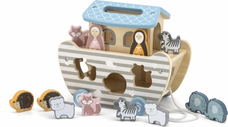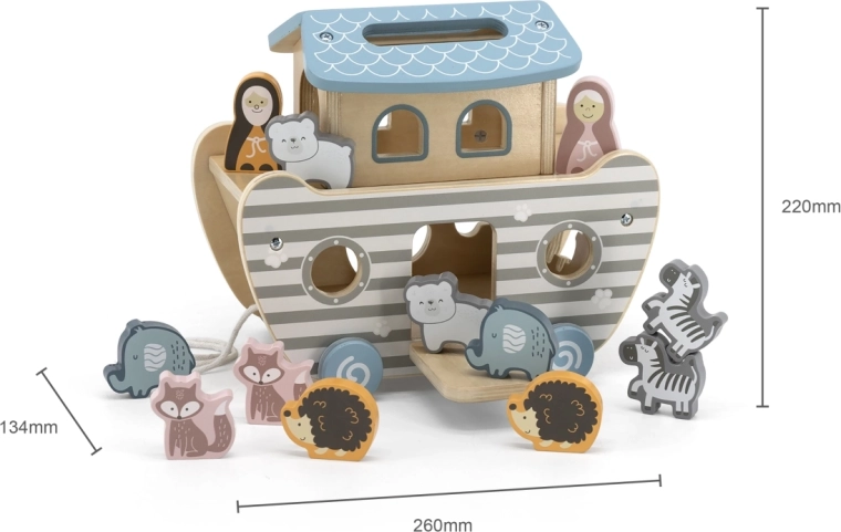 Deze kwalitatieve houten Noachs Ark combineert meerdere speelelementen in één slimme speelgoedset: kinderen plaatsen dieren in de passende openingen, trekken het bootje aan een koord en verzinnen hun eigen verhalen. De stabiele afwerking en zachte kleuren bevorderen concentratie en fantasie.