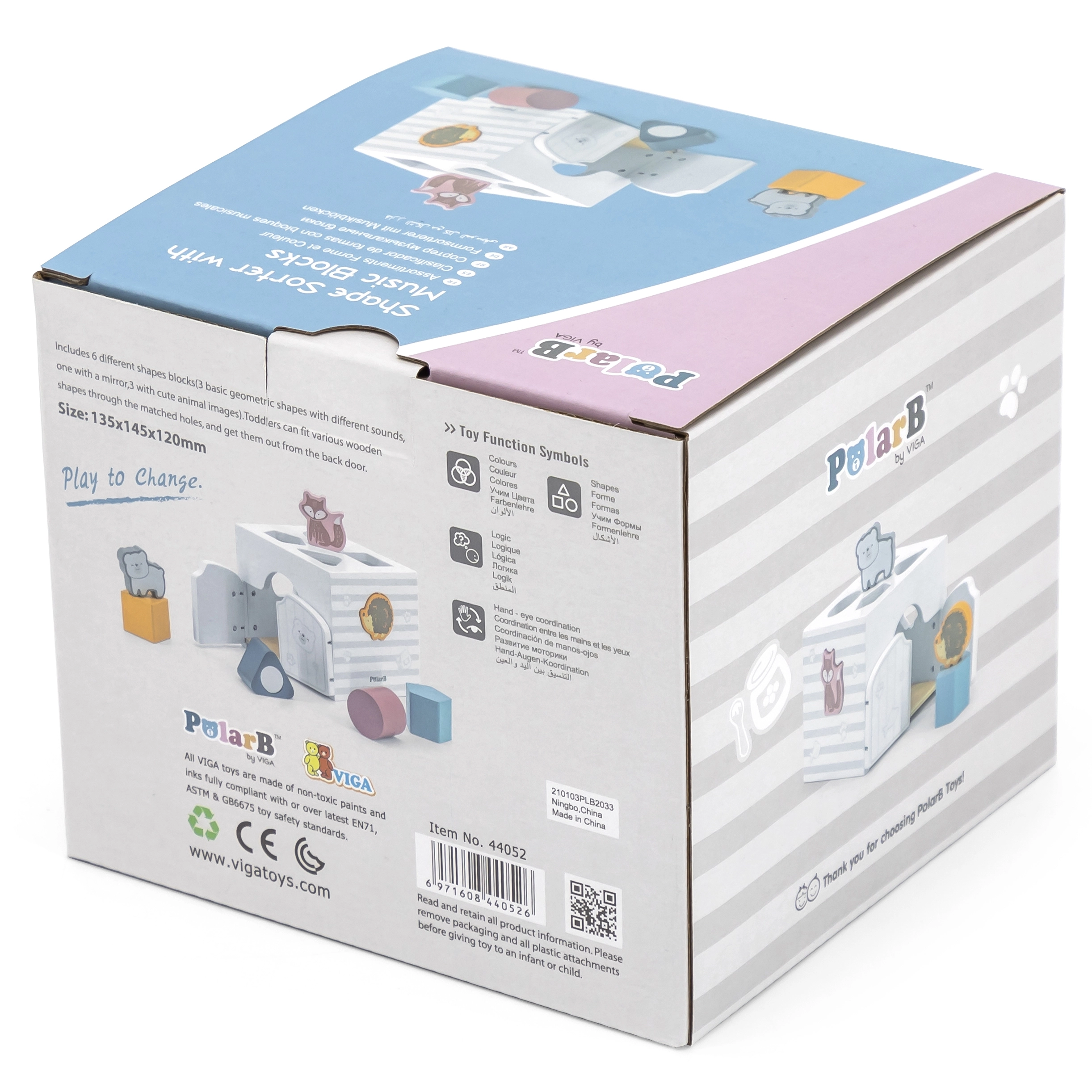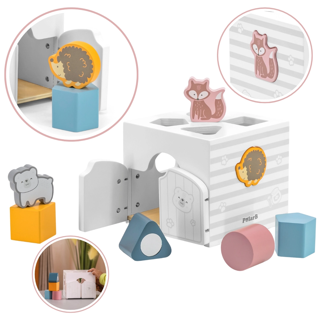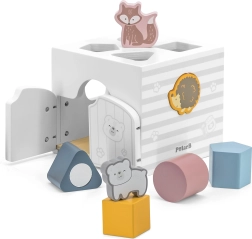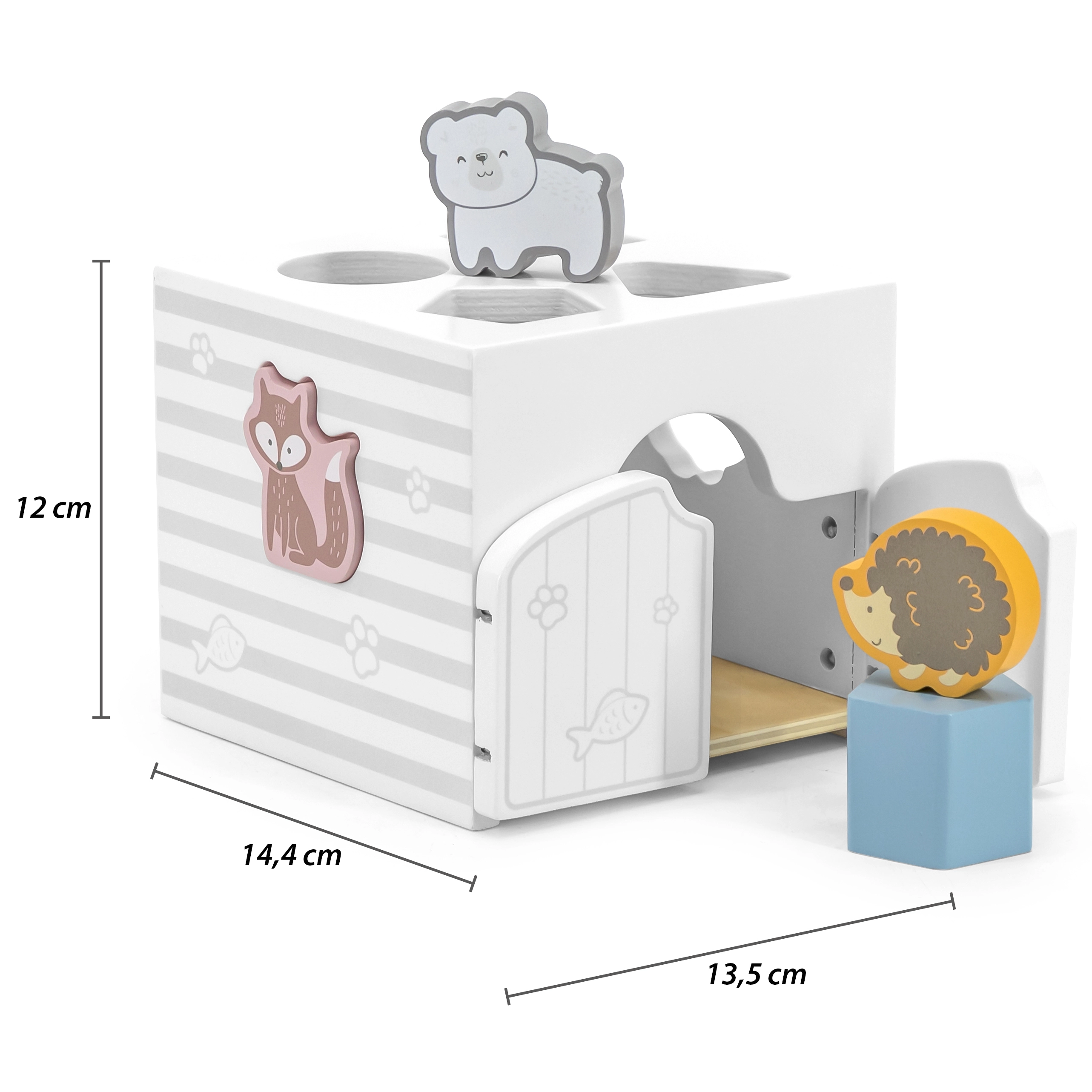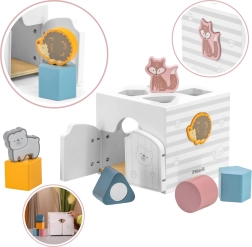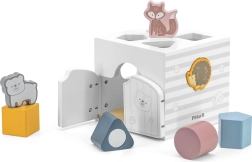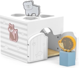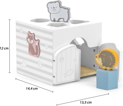 Houten inlegpuzzel met dieren. De blokjes rammelen. Afmetingen van de inlegpuzzel ca. 13,5 x 12 x 14,4 cm. Afmetingen van de verpakking ca. 15 x 14,5 x 13 cm. Leeftijd 18m+