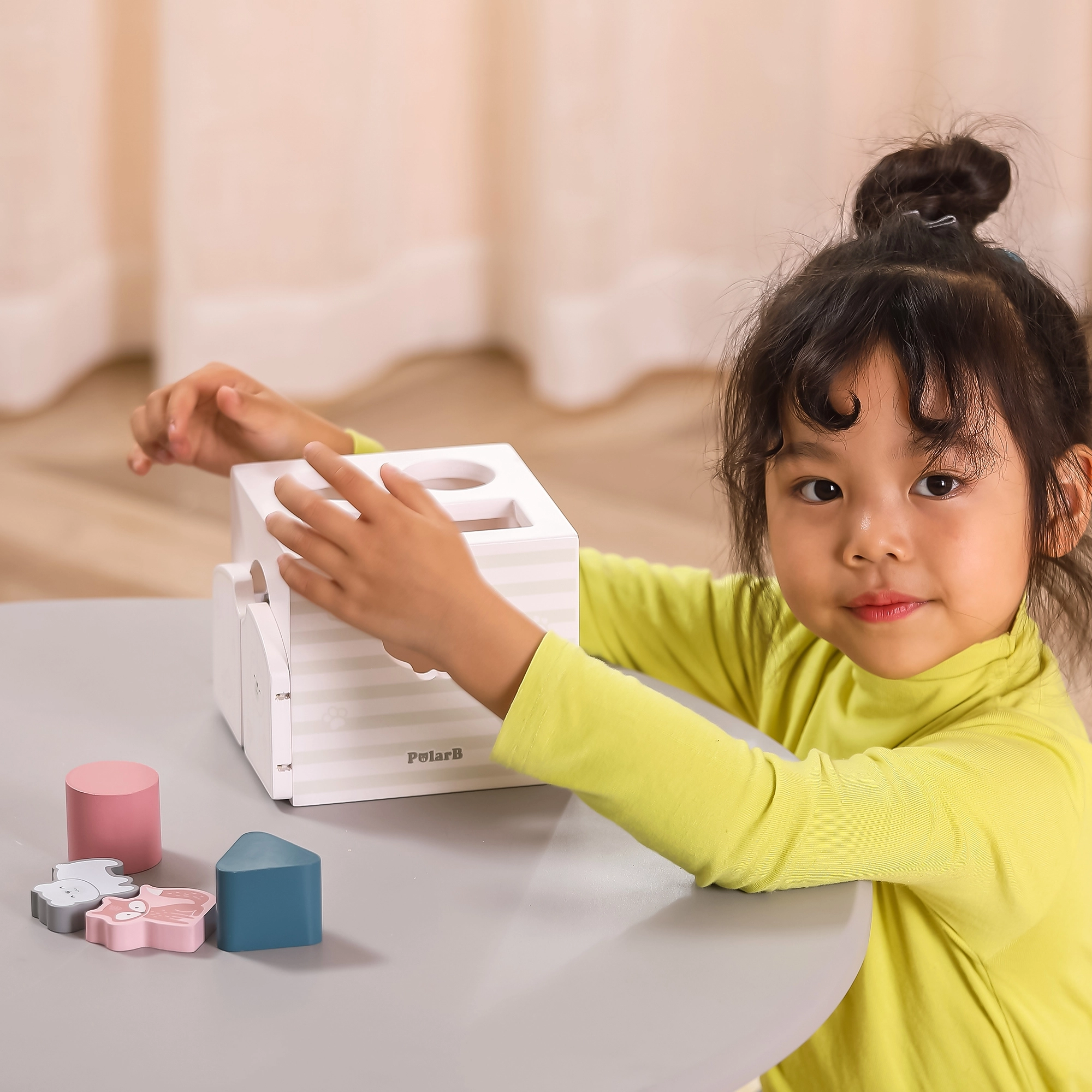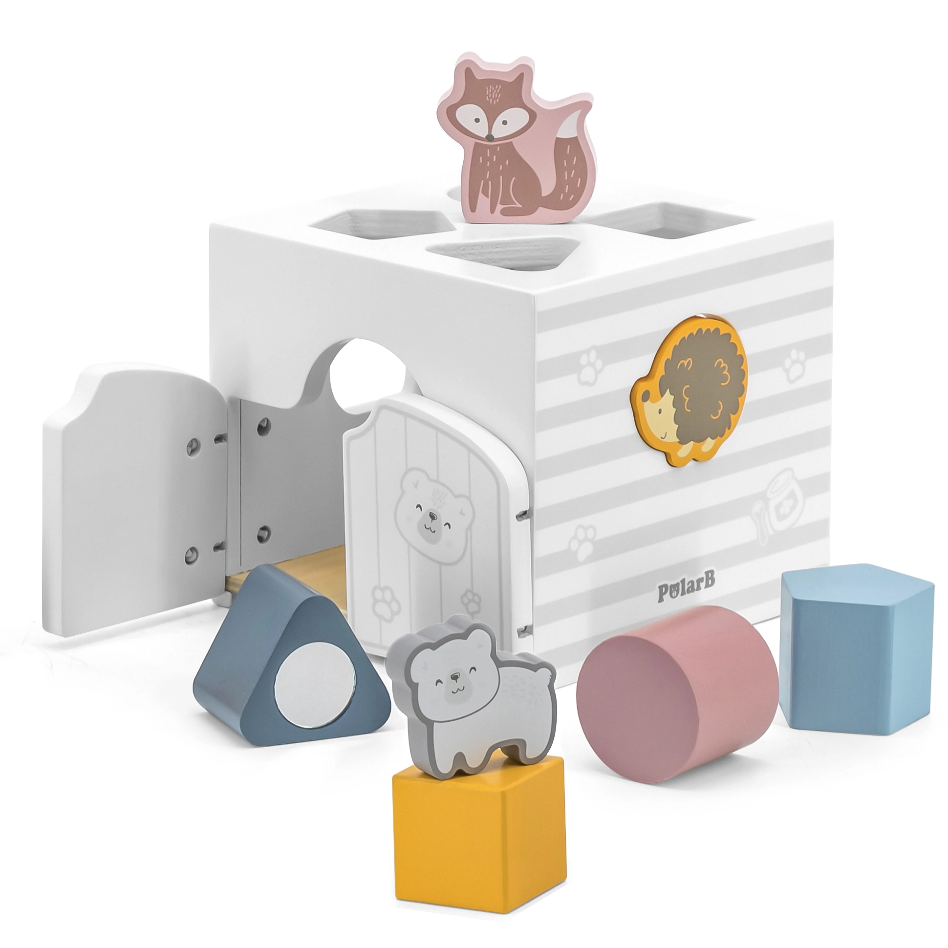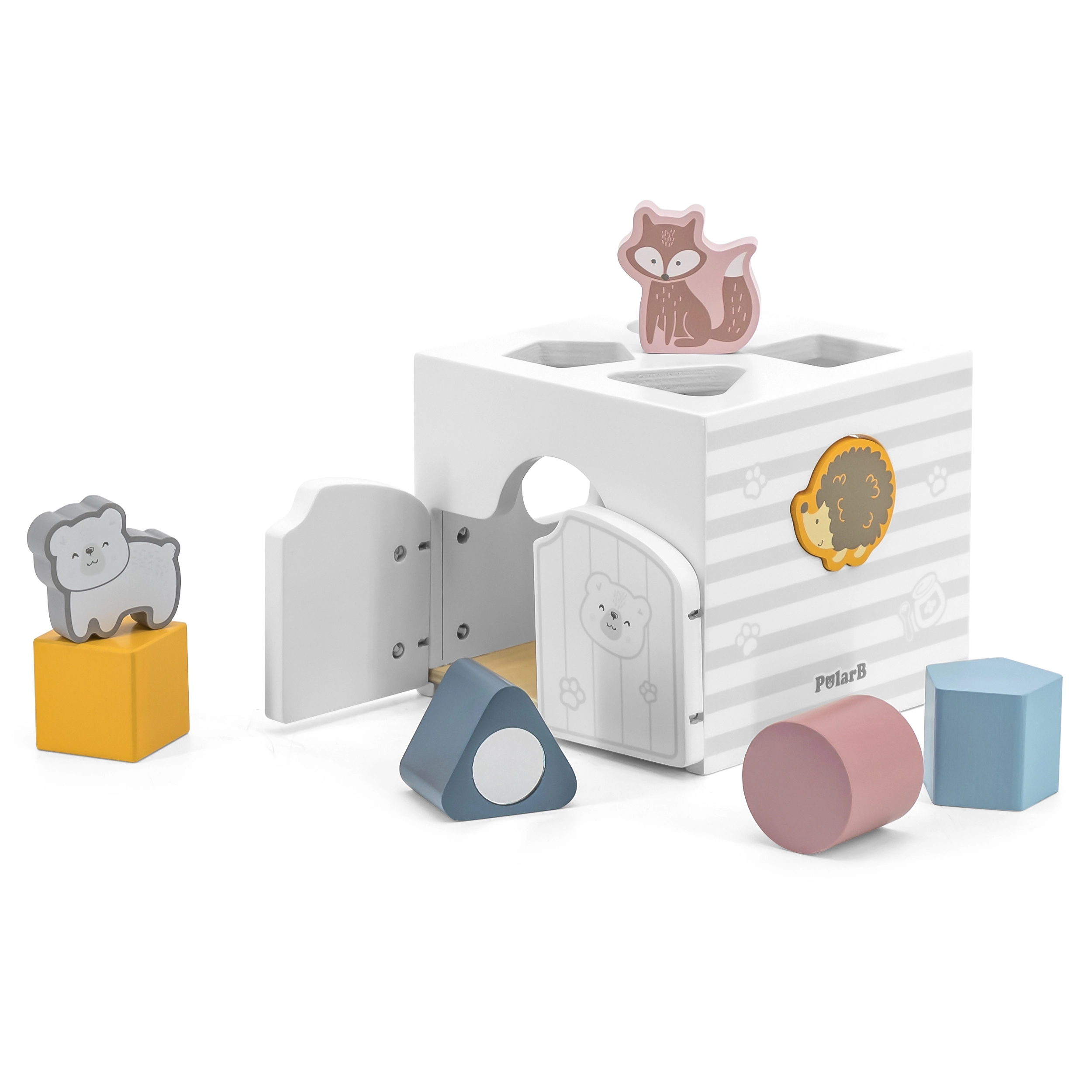 Houten inlegpuzzel met dieren. De blokjes rammelen. Afmetingen van de inlegpuzzel ca. 13,5 x 12 x 14,4 cm. Afmetingen van de verpakking ca. 15 x 14,5 x 13 cm. Leeftijd 18m+