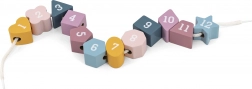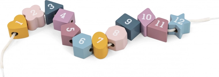 Elk stukje heeft een opening om met het koord door te rijgen – traint grijpen, oog-handcoördinatie en geduld.