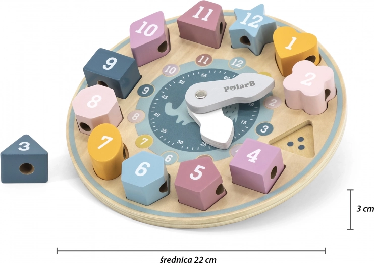 De POLARB houten kinderklok combineert vormensorteren, cijferpuzzelen en rijgen in één veelzijdig educatief speelgoed. Twaalf genummerde stukjes in geometrische vormen passen in de corresponderende uitsparingen op de wijzerplaat, terwijl de beweegbare wijzers kinderen leren de klok te lezen. Elk stukje heeft een opening om gemakkelijk met het koord door te rijgen, wat de fijne motoriek en concentratie op een natuurlijke manier ontwikkelt.