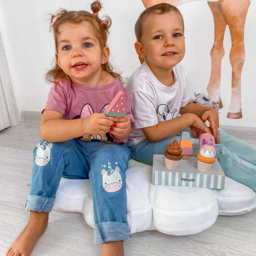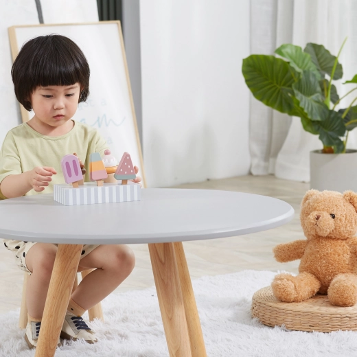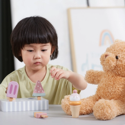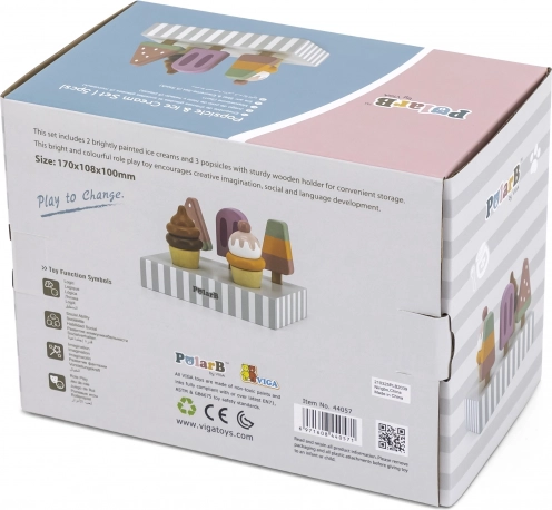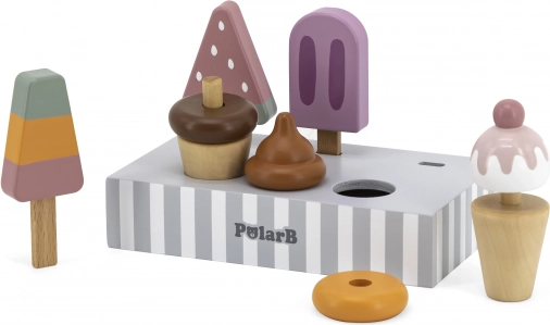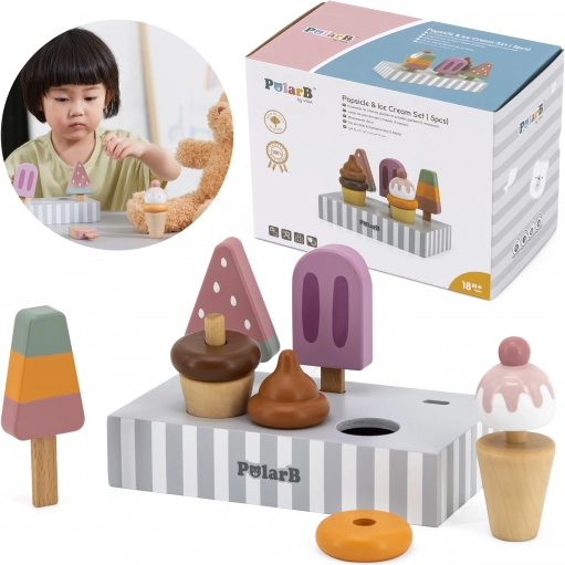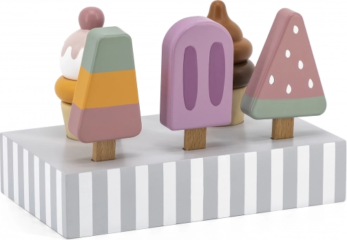 De set van 5 houten ijsjes in aantrekkelijke kleuren brengt kinderen eindeloos veel speelplezier. De ijsjes staan op een stabiele houten standaard, die zowel dient om tentoon te stellen als voor overzichtelijke opslag. Alles is gemaakt van hoogwaardig hout en geverfd met veilige, niet-giftige verven.