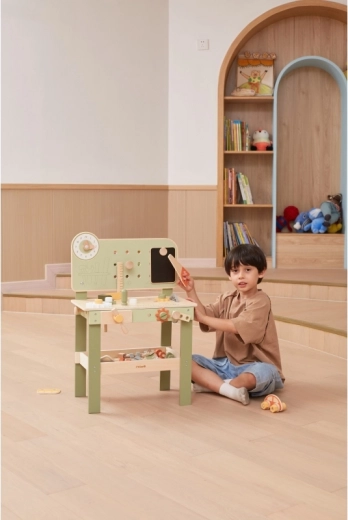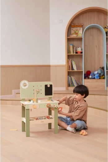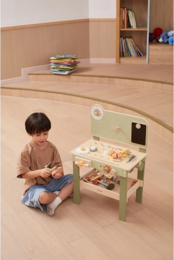De stijlvolle kinderwerkbank in een natuur-groene uitvoering biedt een realistische werkplaatsbeleving in een veilige, houten vorm. Kinderen kunnen schroeven, wieltjes van het autootje verwisselen, de onderdelen “zagen”, tandwielen in elkaar zetten en de principes van oorzaak en gevolg ontdekken. Dankzij de overzichtelijke opbergruimte zijn alle onderdelen en het gereedschap altijd binnen handbereik.